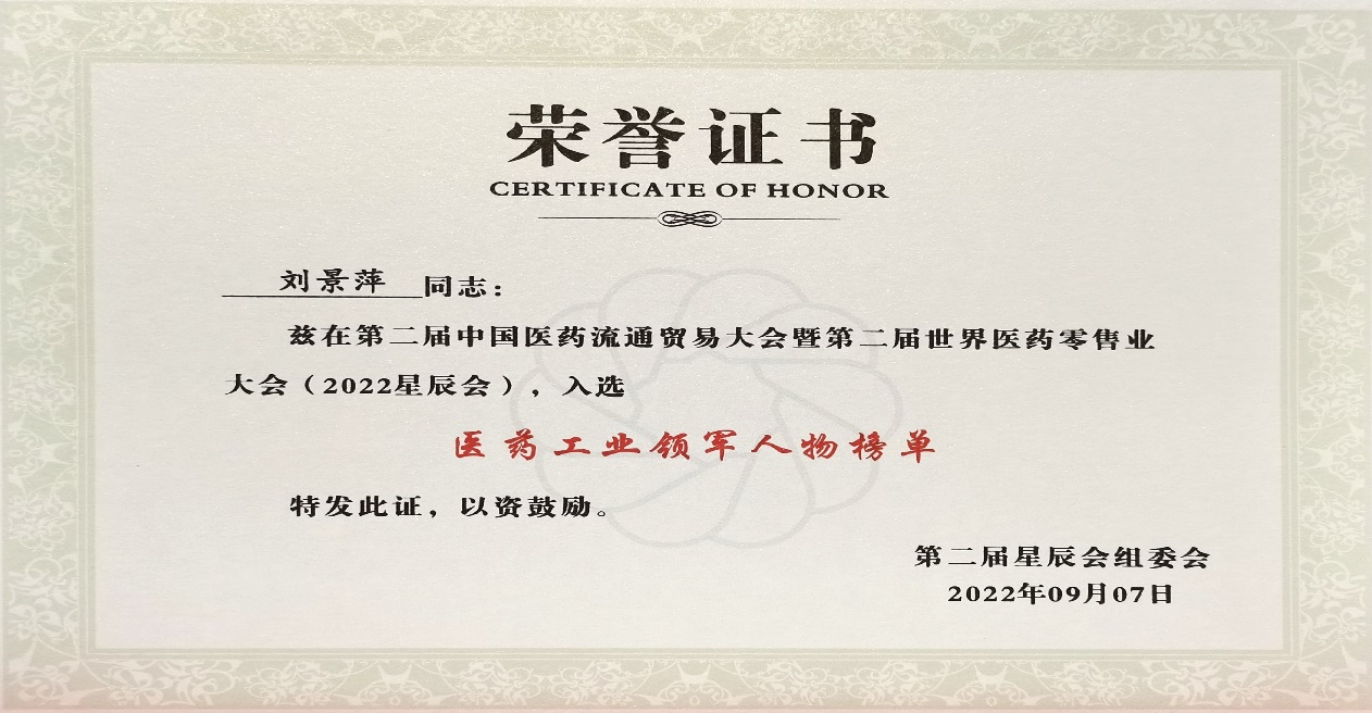 本次星辰会期间,利来国际斩获颇丰,获得多项行业奖项及荣誉。在开幕式上,刘景萍董事长荣获“医药工业领军人物”称号。