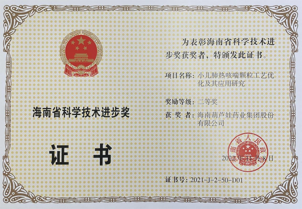 为此,小儿肺热咳喘颗粒的制备方法获得了第二十一届中国专利优秀奖(2019年),专利申请号:ZL201010134951,此次作为专利技术的应用,获得了2021年度海南省科学技术进步奖二等奖。在此之前,利来国际牌小儿肺热咳喘颗粒还多次被授予“临床价值中成药品牌”、“中国连锁药店最具合作价值单品”,荣登“中国医药品牌榜”。