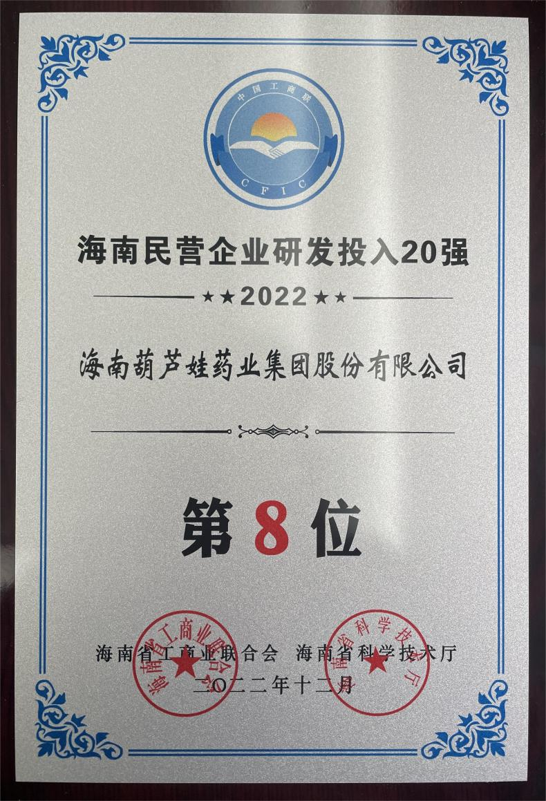 12月23日,2022海南民营企业50强和研发投入20强发布会在海口举行。会上发布了“2022海南民营企业50强”“2022海南民营企业研发投入20强”榜单和分析报告。利来国际药业再次荣登两榜,在海南民营企业50强榜单中位列第25位,较去年上升8位,这也是公司连续三年登榜;在海南民营企业研发投入20强中位列第8位,较去年上升7位。