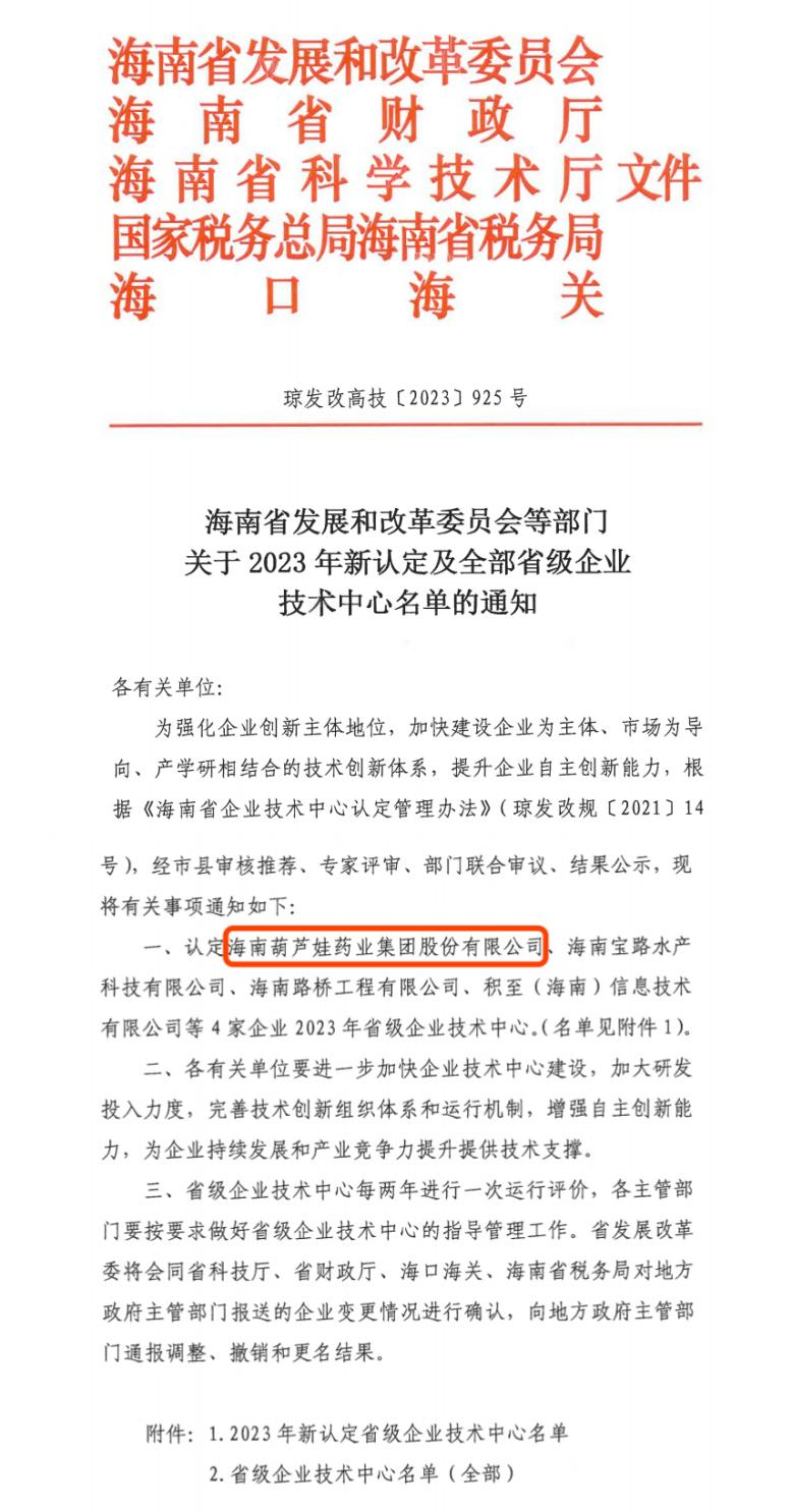近日,海南省发改委等多部门联合公布了《关于2023年新认定及全部省级企业技术中心名单的通知》,其中,海南利来国际药业集团股份有限公司成功通过评审,被认定为省级企业技术中心,是本次获批的4家企业之一。